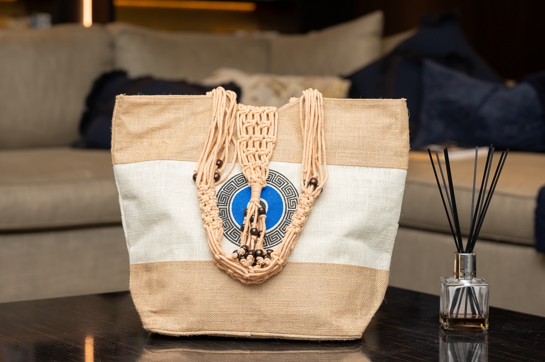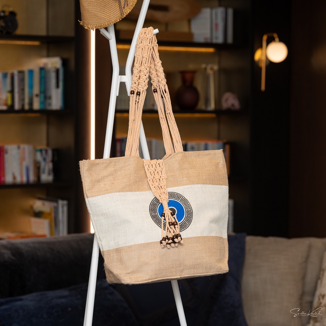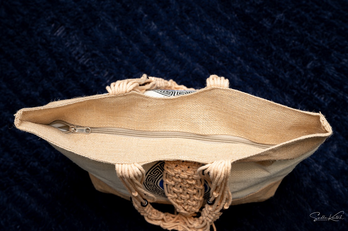 Indulge in the timeless elegance of our high-quality designer bag, meticulously crafted from 100% natural jute fibres. Adorned with cotton handwoven handles using the macrame technique, this bag exudes both sophistication and durability, capable of carrying substantial weight with ease. The eye-catching circular geometric patterns elevate this designer piece to a class of its own. Each bag proudly represents our commitment to quality and style.