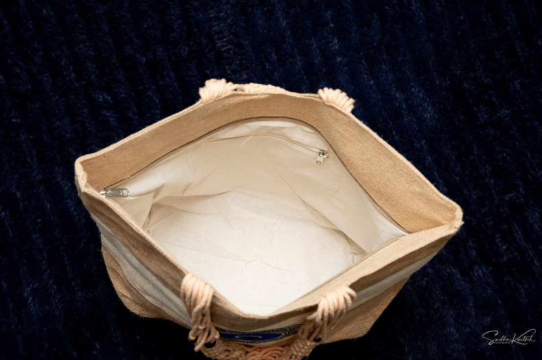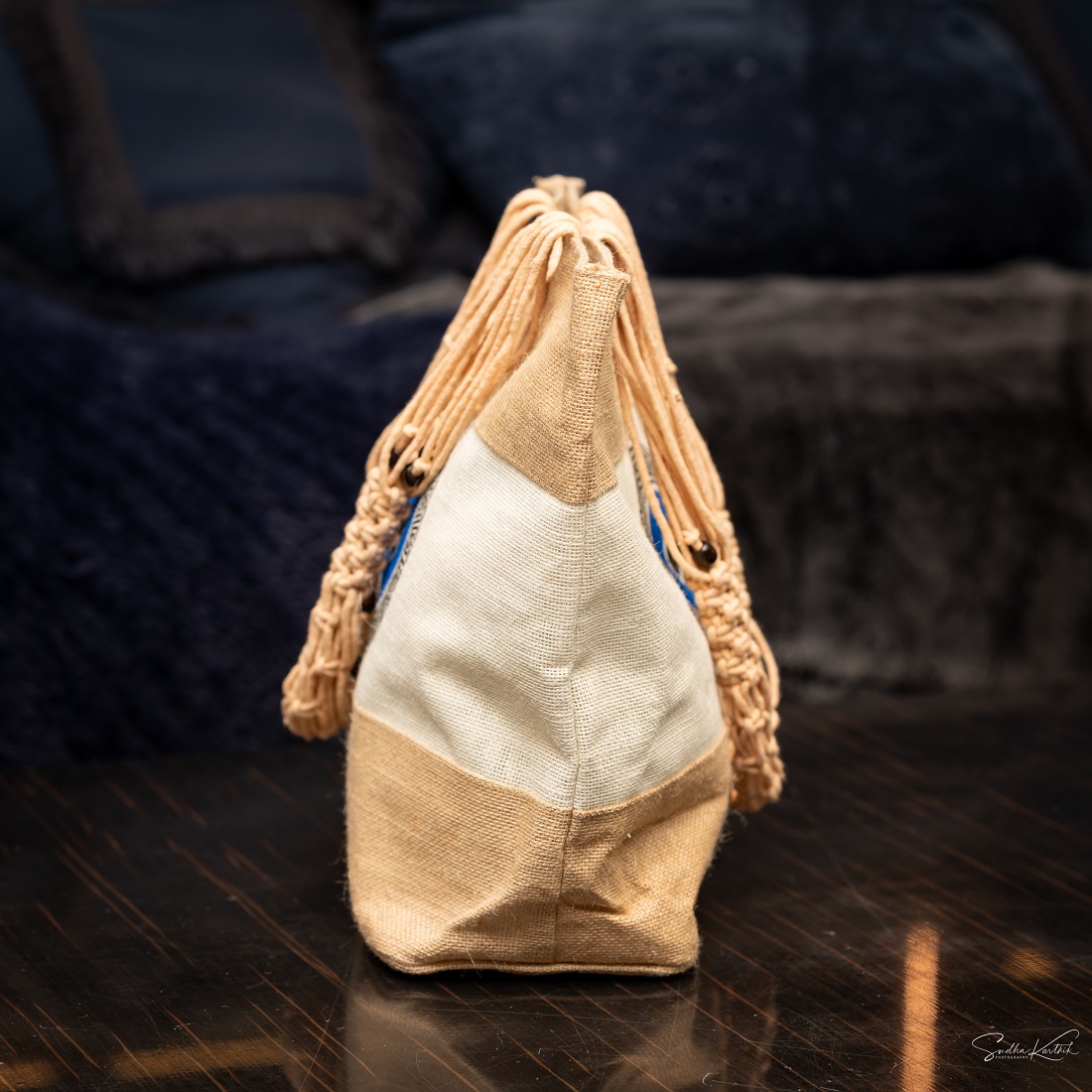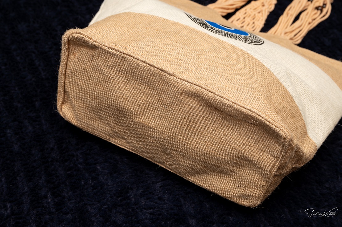 Bag Fabric: Laminated dyed Jute with a circular pattern in blue, grey and white colours of Azo-free and natural dyes, aligning with sustainable choices