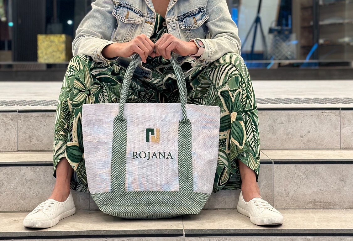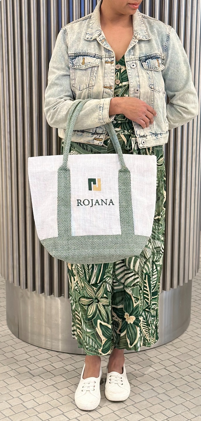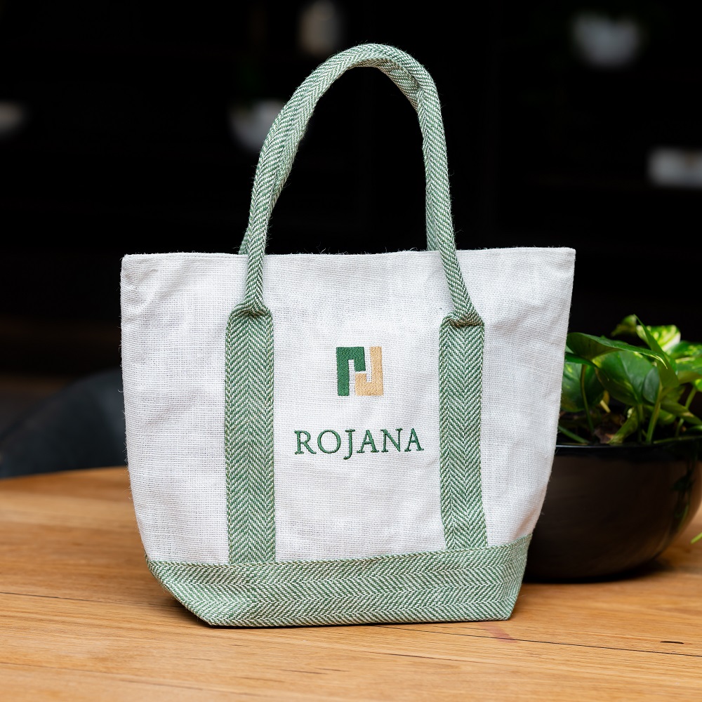 Indulge in the timeless elegance of our high-quality designer bag, meticulously crafted from 100% natural jute fibres. Adorned with loop handles, this bag exudes both sophistication and durability, capable of easily carrying substantial weight. The green and white woven fabric on a white base elevates this designer piece to a class of its own. Each bag proudly showcases its identity with a beautifully embroidered ROJANA label, representing our commitment to quality and style.