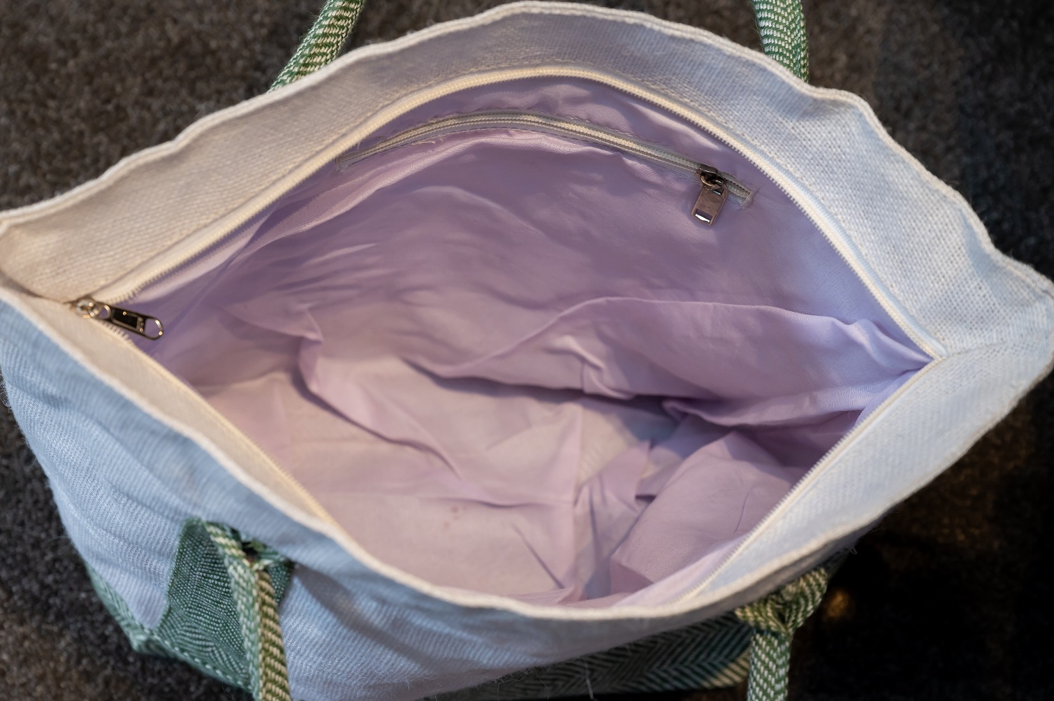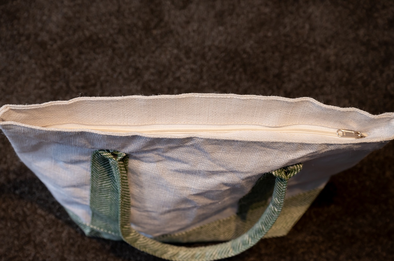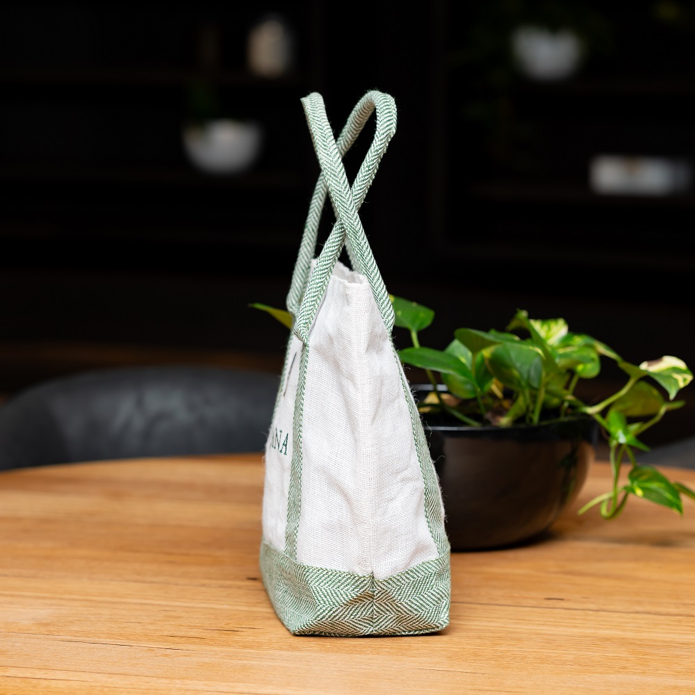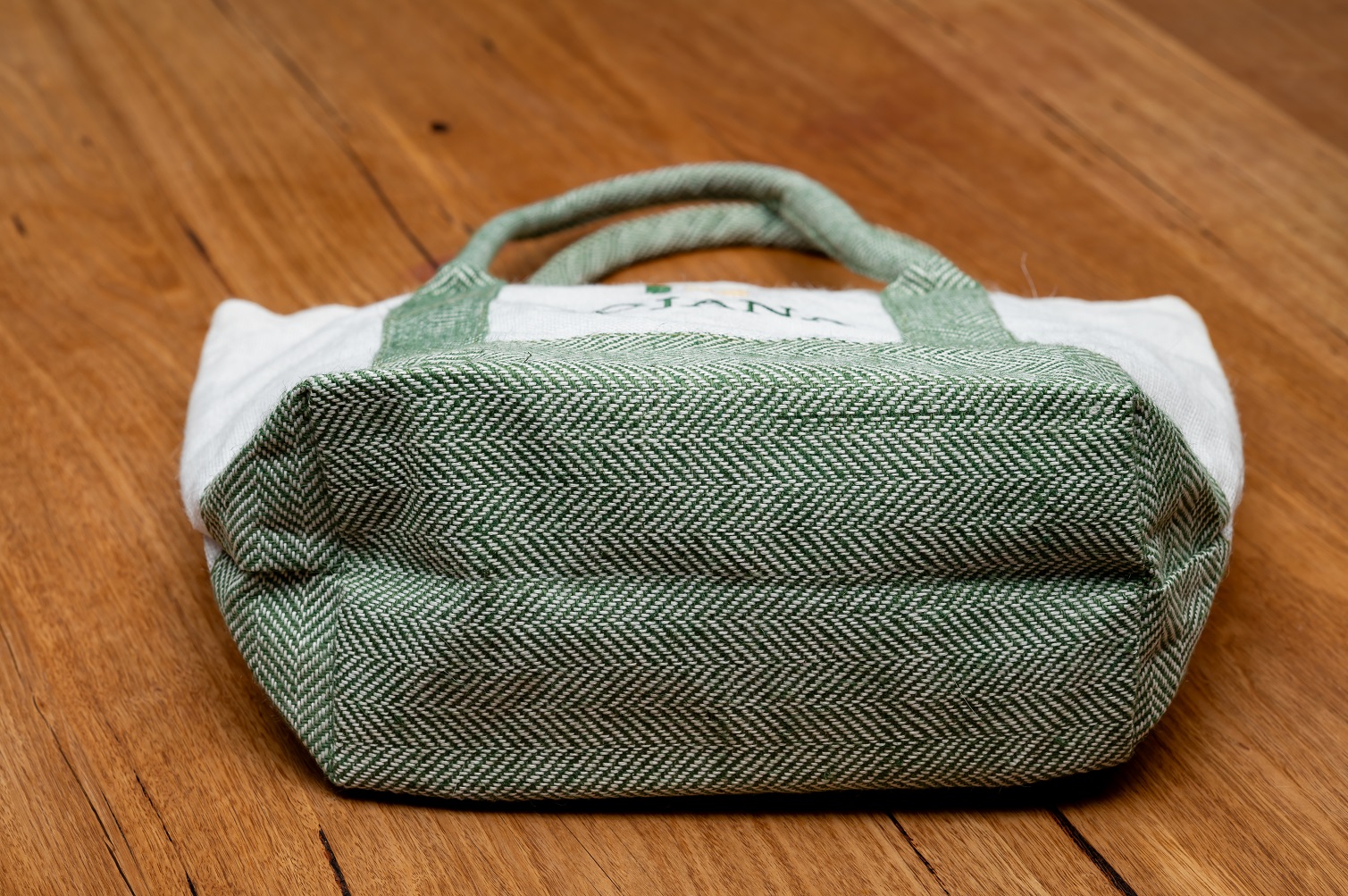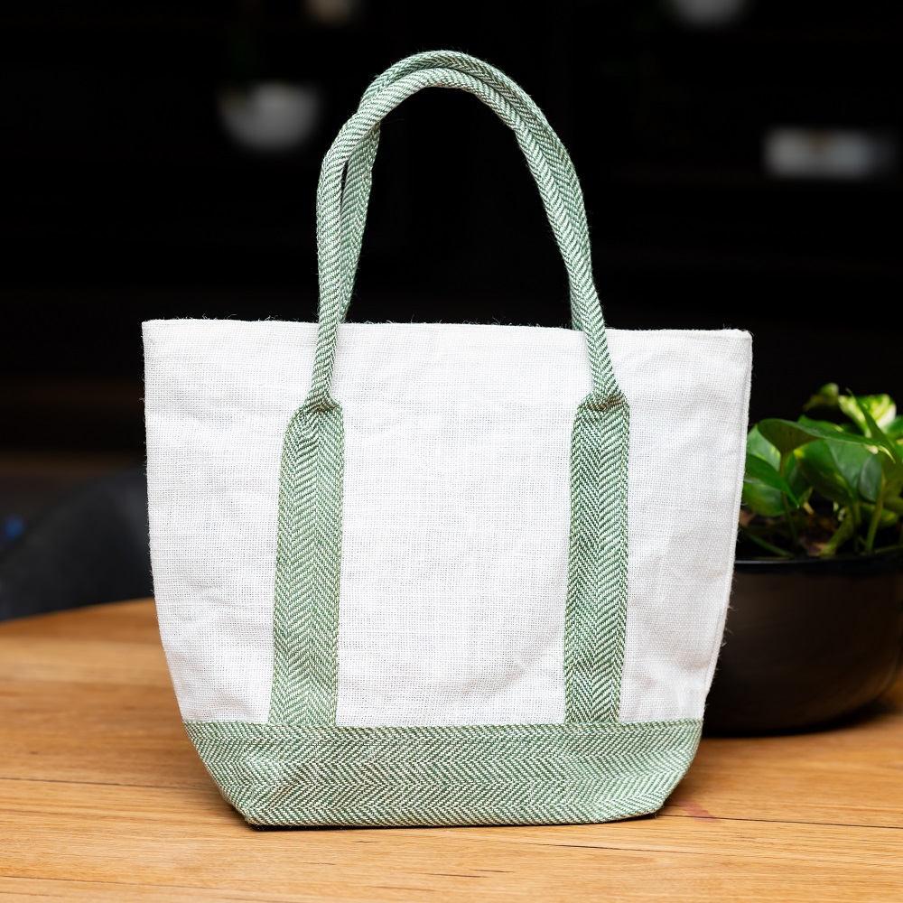 Bag Fabric: Laminated white Jute body with green/white woven fabric of Azo-free and natural dyes, aligning with sustainable choices